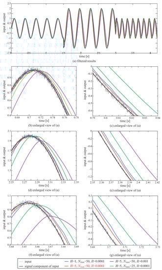 Figure 13 shows the output of AG-PSMF under the parameter values recommended by the guidelines (hereafter denoted as the AG-PSMF Guideline). For comparison, the results of AG-PSMF with four different sets of parameter values are also included. The initial states of all conditions are set zeros at s. The results clearly show the advantage of using . That is, the AG-PSMF Guideline is less prone to overshooting than in the case of . In addition, compared with the cases of and , the output amplitude of the AG-PSMF Guideline is closer to that of signal component of the input. Furthermore, the phase lag of the AG-PSMF-Guideline is the smallest among the four cases. As a whole, one can conclude that AG-PSMF performs the best under the recommended parameter values.