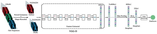 Inspired by the deep learning breakthroughs in the image domain [12,13,14] where rapid progress has been made in the past few years in feature learning, and various pre-trained deep convolutional models [12,13,15] were made available for extracting image and video features, DeepGait was proposed. These features are the activations of the network’s last few fully-connected layers which perform well in the other vision tasks [14,15,16,17]. A convolutional neural network (CNN) has been successfully demonstrated in many research fields, such as face recognition [18,19,20] and human action recognition [15] which are relevant to gait recognition. However, to the best of our knowledge, few studies have applied deep learning features in video sensor-based human gait recognition except for [21,22]. In this paper, we proposed a novel gait representation, DeepGait based on VGG-D [12] features using max-pooling on each gait cycle. If the gait video sequence has more than one cycle, we just choose the first one. Our proposed DeepGait differs from [21] in two ways: (1) they first needed to compute the traditional gait representations (GEI, FDF), and regard them as the input data while we just used the original silhouette images; (2) their net needed to be trained on the gait dataset while ours just used the pre-trained VGG-D model without any fine-tuning.