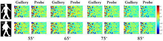 Examples of the 256-dimensional DeepGait after dimension reduction under four observation views (, , , ) . S1 and S2 represent two different subjects, separately. We rearrange the vector as matrix for the convenience of visualization. Approximately 25% features are non-zero values. Different colors stand for different values.