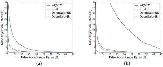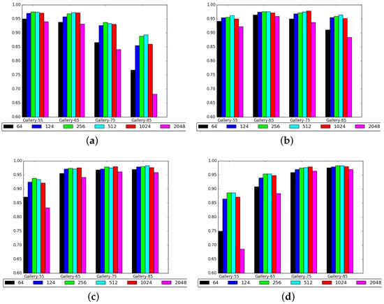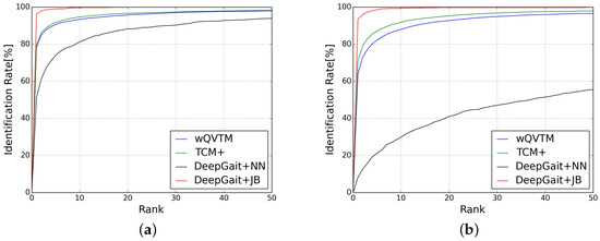 Usually, gait recognition can be divided into two major tasks: gait verification and gait identification as in face recognition [18,19,20]. Gait verification is used for verifying whether two input gait sequences (Gallery, Probe) belong to the same subject. In this paper, we calculated the similar score () using Joint Bayesian to evaluate the similarity of two given sequences. Euclidean distance was also adopted as a baseline method for comparison. In gait identification, a set of subjects are gathered (The gallery), and it aims to decide which of the gallery identities are similar to the probe at test time. Under the closed set identification condition [31], a probe sequence is compared with all the gallery identities, then the identity which has the largest is the final result.