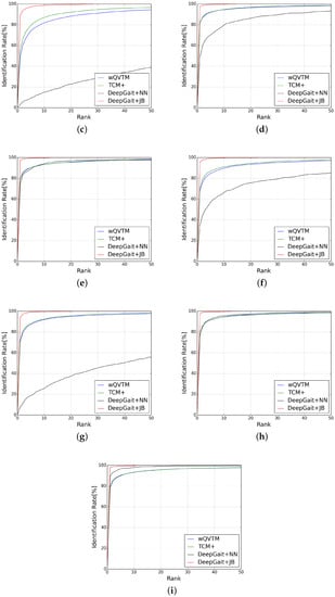 Cummulative Match Characteristics (CMC) curves under different cross-view settings. (a) G-55:P-65; (b) G-55:P-75; (c) G-55:P-85; (d) G-65:P-55; (e) G-65:P-75; (f) G-65:P-85; (g) G-75:P-55; (h) G-75:P-65; (i) G-75:P-85.