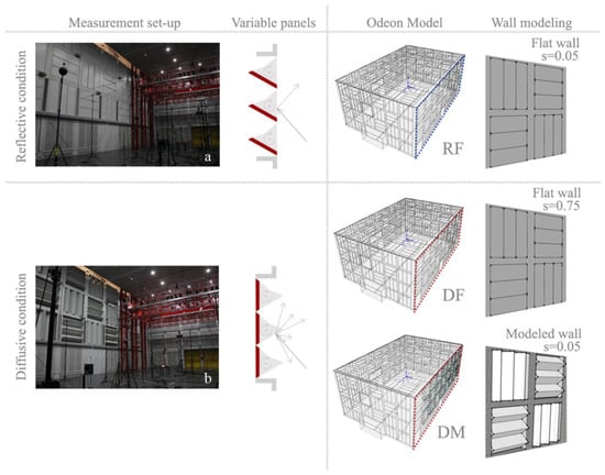 Photos of the two acoustic conditions in the hall: reflective (a) and diffusive (b). CAD model (RF) for the reflective condition, which is modeled with flat surfaces and s = 0.05. Two CAD models for the diffusive condition: DF (diffusive flat) the prisms have been modeled as a flat surface with s = 0.75, while in the DM (diffusive modeled) the triangular structure has been maintained and s = 0.05 is assigned to each small face.