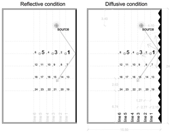 Scheme of the plan for the two acoustic conditions in the hall: reflective and diffusive. The other surfaces in gray were set in an absorptive condition, except for the floor, which was made of a hard reflective surface. The 24 microphone positions are indicated in a crossed array that occupies half of the hall. Positions 1, 3, and 5 were used to perform the binaural simulations and then in the listening test.