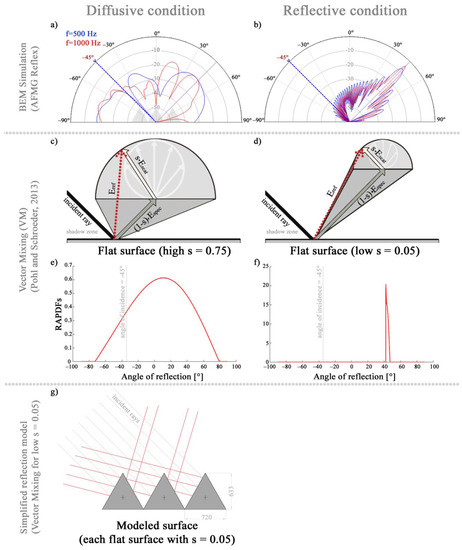 Moreover, the Reflection Angle Probability Density Functions (RAPDFs) have been calculated using the open source scripts [47]. These functions describe the angle-wise probability for a striking energy particle/ray to get reflected under a certain angle for a given incidence angle and scattering coefficient. The models shown in Figure 4c,d apply to the IRCAM models DF and RF (diffusive flat and reflective flat models). A simplified reflection model has been built for 3D modeled periactes (Figure 4g), which apply to the DM model of the room, i.e., a 3D modeled diffusive wall. In this case the incident rays have been reflected specularly, but the vector mixing model for low scattering values is applied to each reflection in Odeon. The surface edge diffraction is present in all vector mixing models, but it has not been represented in the schemes of Figure 4.
