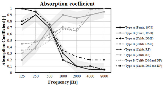 Figure 5. Calibration of the absorption coefficients of type A and type B materials. The gray area shows the lower and upper limit of the acceptable tolerances, as described in the materials’ properties in [37]. - (4)