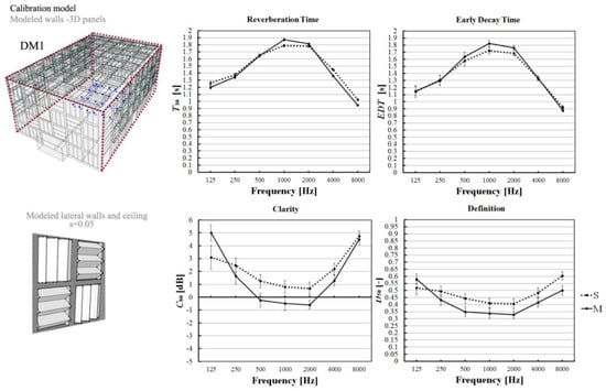 Figure 6. Calibration model (DM1) and objective acoustical parameters obtained after the calibration (Type A and Type B values given for DM1 model materials in Table 1). The diffusive surfaces (3D panels) have been framed in dotted lines. S and M indicate the simulation and measurements results, respectively. - (2)