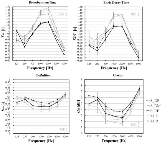 Reverberation time (T30), early decay time (EDT), definition (D50) and clarity (C80) simulated and measured values given in octave bands for both reflective (RF) and diffusive (DF and DM) conditions. The step of y-axis is equal to 1 JND of each parameter. S and M indicate the simulation and measurements results, respectively.