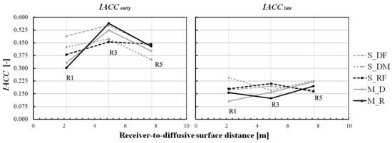 The influence of the different modeling alternatives of the diffusive surfaces was more evident at positions close to the variable wall for the IACC parameter. The values of this parameter at the positions close to the lateral wall were different for the DM and DF conditions. Robinson et al. [64] showed that the correlation between the impulse responses at two ears at positions close to any surface is lower due to effects of the surface proximity on the impulse response of the ear oriented towards it. In this way, the binaural impulse response is affected asymmetrically on each ear channel (left and right). In the configuration investigated in this study, the right ear is oriented towards the variable wall, while the left ear is oriented towards the other lateral wall, which is absorptive. Thus, the differences in reflections between the two ears are emphasized also by this asymmetric distribution of the material properties, i.e., the correlation between the two ears decreases.