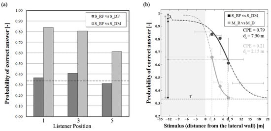 As explained above, in order to build the psychometric curves, the percentage of correct answers is correlated to the stimulus intensity, which is decreased or increased by a constant step [58,59]. In this study, the stimulus is represented by the difference between the reflective and the diffusive condition compared at each position. Since there is no method to quantify this stimulus intensity variation between the two conditions, the stimulus intensity variation is associated with the distance from the lateral wall, which increased constantly by 2.77 m (at 2.15 m, 4.92 m, and 7.69 m for position 1, 3, and 5, respectively).