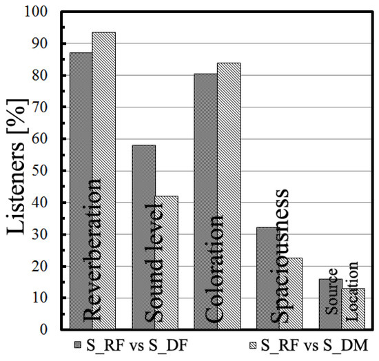 Listeners’ subjective evaluations on the perceived differences between the simulated reflective (RF) and diffusive conditions (DF and DM). The y-axis depicts the percentage of listeners that reported the attributes given in the x-axis.