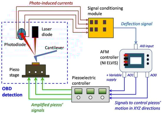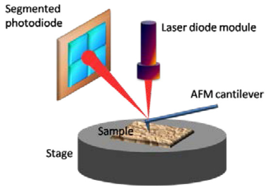 In AFM, the surface of interest is scanned by a sharp tip mounted at the end of a cantilever. The force between the tip and sample can be determined by measuring the deflection of the cantilever. Due to simple design and easy alignment, OBD [21] is the most common setup in commercially available AFM systems. In an OBD system, the key components that act as deflection sensors are the laser beam, the cantilever, and the photodiode as shown in Figure 1. Typically, the deflection is measured using alaserspot reflected from the back of the cantilever into a segmented photodiode. The laser beam that is deflected from the backside of the cantilever provides measurements of the difference in light intensities between the upper and lower segments of a four-quadrant photodiode. The photo-induced currents from the photodiode are fed into a signal conditioning module which produces a voltage signal proportional to the differences in the light intensities between the upper and lower segments of the photodiode. This voltage signal is known as the deflection signal. Through data acquisition and a control system, the height of the sample stage is controlled to maintain a constant force between the AFM tip and the sample. A topographic image of the sample is obtained by plotting the height versus its x-y position on the sample.