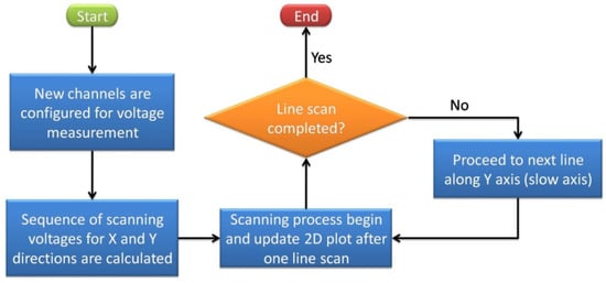 Flowchart of scanning process. There are three major sections in the software. First, the input and output channels are configured for measurement. Second, the sequence of scanning voltages is generated. Finally, the actual scanning process begins and the 2D plot is updated after every line scan.