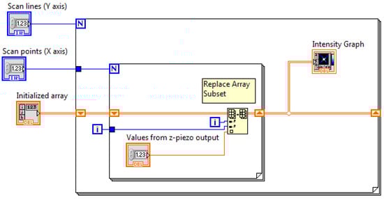 A simplified schematic of the scanning sequence in the LabVIEW block diagram. The nested “For Loops” plays an important role in performing the scanning sequence efficiently. The inner loop controls positions in the X axis and the outer loop controls voltage steps along the Y axis. The “Replace Array Subset” is used here to update the values of pixels in real-time during the scanning process. The “Intensity Graph” is in the outer loop so that the 2D plot is updated after one line scan. If it is in the inner loop instead, the 2D plot will be updated pixel by pixel.