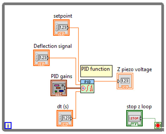 In order to perform imaging in constant-force mode, a feedback controller is required in the AFM system. In our AFM setup, the control of the feedback loop is implemented in the LabVIEW environment without any extra hardware. This approach is flexible and allows us to configure the system settings easily and quickly. Figure 8 illustrates a schematic of the feedback controller in the LabVIEW block diagram. The main unit used in this subroutine is the PID (proportional, integral, derivative) controller. Here, the process variable is the deflection signal from the signal conditioning module. This signal isthen compared to a set-point value (set by the user) internally. The output of the PID controller is then used to drive the Z-piezo through the positive variable power supply channel in our setup. By choosing appropriate values for the P, I, and D terms, the tip of the cantilever “tracks” the surface during scanning and the deflection of the cantilever can be held constant. This program loop runs in parallel with the scanning process.