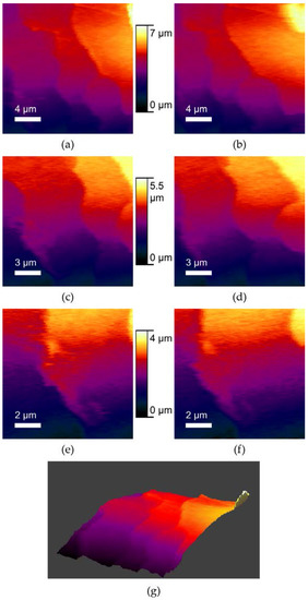 AFM images of author’s hair acquired in constant-force mode: (a) Trace image with scan size of 20 μm × 20 μm; (b) Retrace image of (a); (c) Trace image with scan size of 15 μm × 15 μm; (d) Retrace image of (c); (e) Trace image with scan size of 10 μm × 10 μm; (f) Retrace image of (e); (g) 3D surface plot of (a).