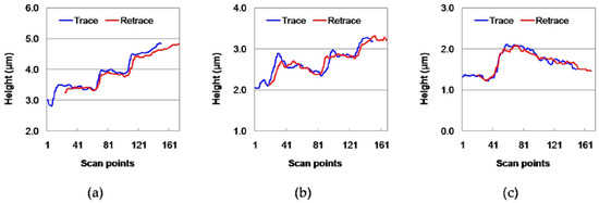 Line scans for trace and retrace extracted from AFM images in Figure 10: (a) Trace and retrace of line 75 extracted from Figure 11a,b, respectively; (b) Trace and retrace of line 75 extracted from Figure 11c,d, respectively; (c) Trace and retrace of line 75 extracted from Figure 11e,f, respectively.