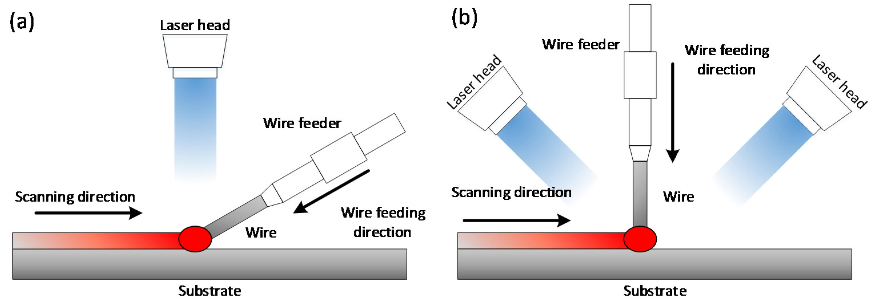 The schematic of laser additive manufacturing with: (a) paraxial wire feeding; (b) vertical wire feeding.