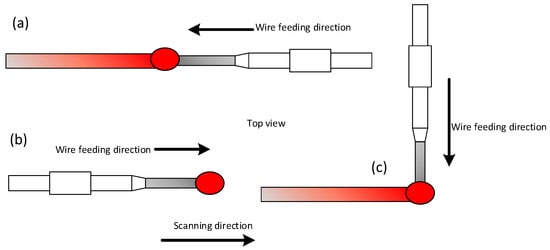 LAM with wire feeding can be divided into vertical wire feeding and paraxial wire feeding [9,17]. LAM with wire feeding evolved from laser wire feed welding, so paraxial wire feeding accounts for the majority of the wire feeding methods, and the schematic drawing of it is indicated in Figure 1a. Although it is easy to implement, there is an anisotropic forming problem in the deposition process due to different wire feed orientations [18]. There are three kinds of wire feed orientations in the deposition process, which are shown in Figure 2. The depositions from front feeding and side feeding have a smoother surface than back feeding [19], and the smoothest surface can be obtained when the wire is positioned at the leading edge of the molten pool in front feeding [20]. Due to the different forming morphologies in different wire feed orientations, different layer thicknesses may appear in the same layer, especially when forming large complex components.