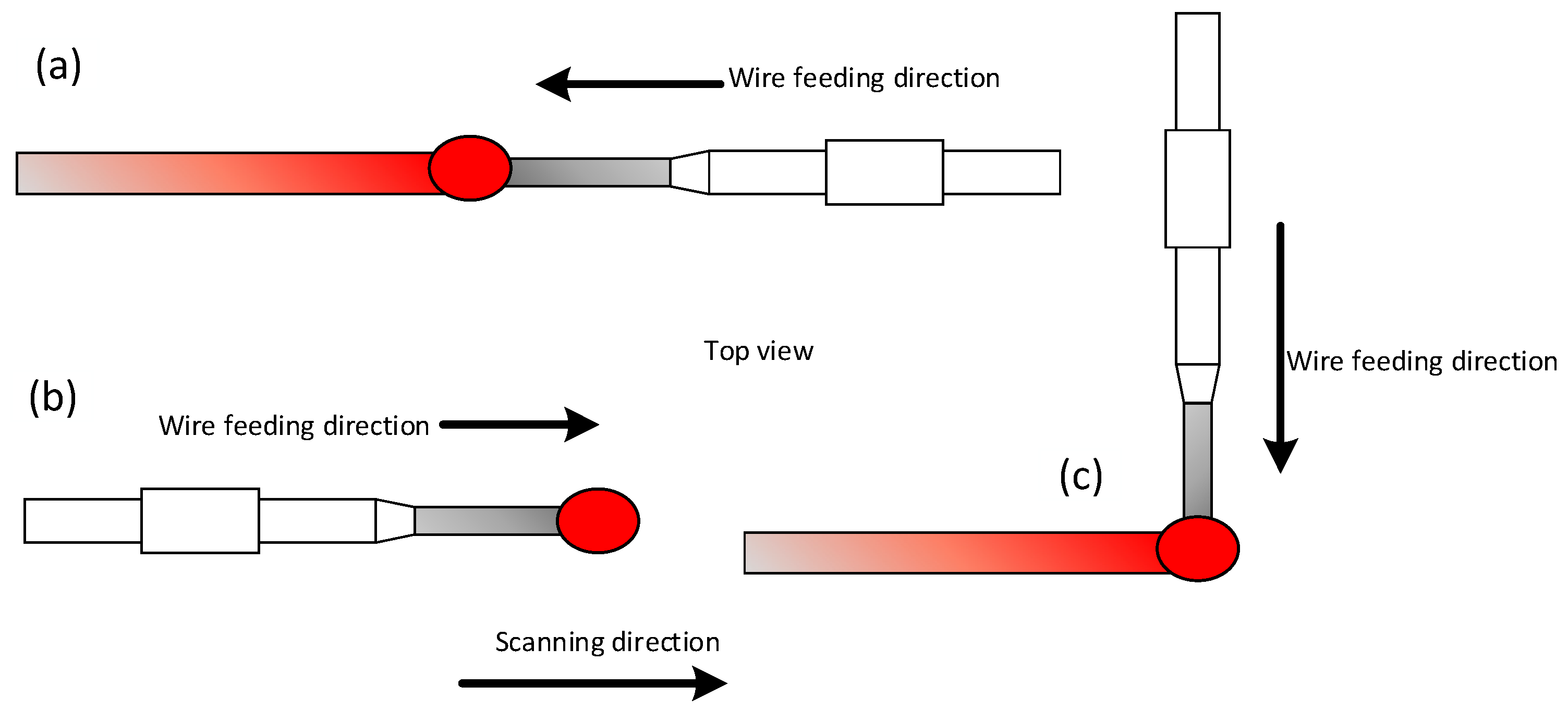 The schematic of wire feed orientations: (a) front feeding; (b) back feeding; (c) side feeding.