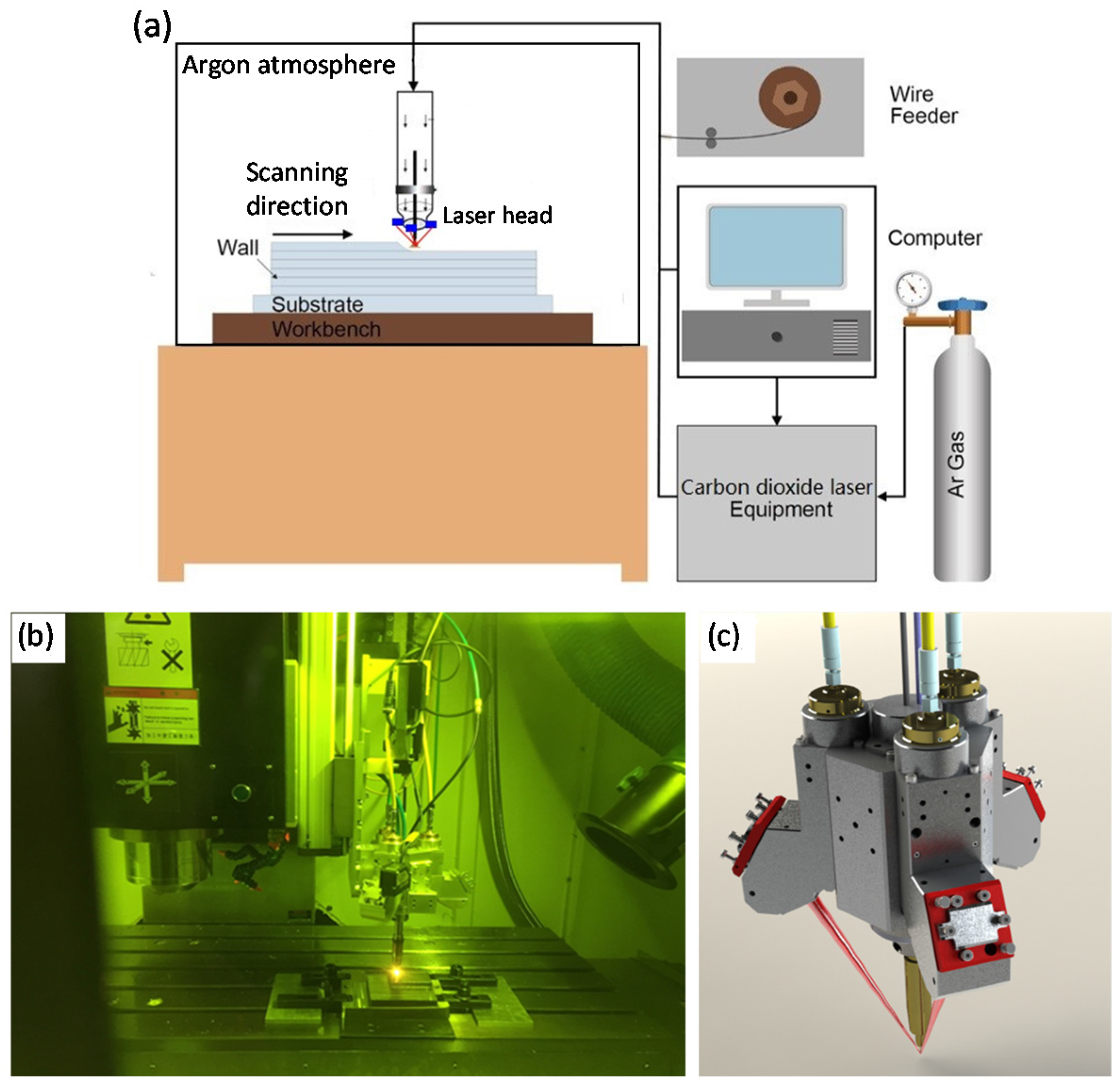 The LAM equipment is shown in Figure 3. The additive manufacturing device is mounted on the three-axis CNC machine (Shenyang Siasun Robot Automation Co., Ltd., Shenyang, China) which uses Simens 828D numerical control system (SIEMENS, Berlin, Germany) as shown in Figure 3a. The stroke of each axis is 1000 mm (X), 800 mm (Y) and 600 mm (Z), all of which are driven by servo motor (Shenyang Siasun Robot Automation Co., Ltd., Shenyang, China) and ball screw (Shenyang Siasun Robot Automation Co., Ltd., Shenyang, China).