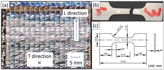 The scanning direction (T direction) and building direction (L direction) of the block sample are shown in Figure 5a. Three tensile specimens were obtained from the middle of the block in each direction by wire-cutting techniques (Figure 5b,c). Static tensile tests at room temperature were carried out on an INSTRON 5966 material testing machine (INSTRON, Boston, MA, USA). The max load capacity of it is 10 kN and the drive type is powerful motors. The strain is acquired by video-extensometer (INSTRON, Boston, MA, USA). The cross-head displacement speed was 0.01 mm/s.