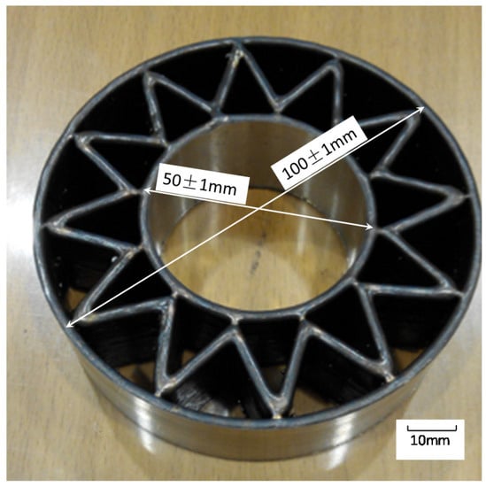 The additive manufacturing device consists of four functional modules: laser focusing module, vertical wire feeding module, shielding gas module and water-cooling module as shown in Figure 3b. In the laser focusing module, three laser beams are focused onto the wire at a certain angle (in this paper, the angle between the wire and the laser beam is 55°). In vertical wire feeding module, the wire is fed vertically to the substrate. The additive manufacturing device driven by the actuator moves along the arranged path, thus the components can be formed. Argon gas is injected around the feeding wire to prevent metal oxidation at high temperatures. The water cooling module provides cooling to the laser head to ensure long-term stable operation. The operating temperature of the laser head is 10 to 25 °C.