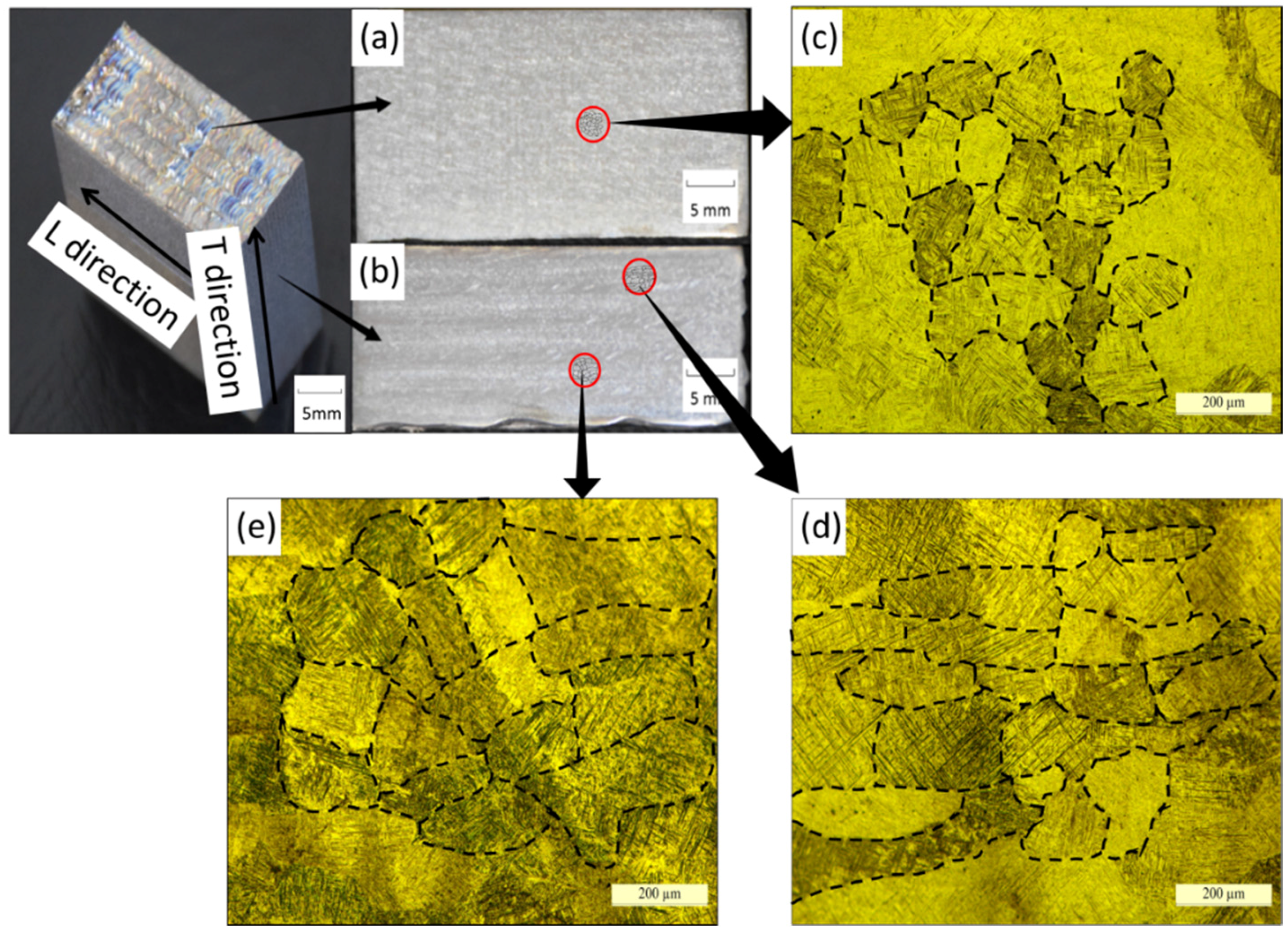 Macrostructure of the fabricated samples: (a) all fine equiaxed grains evenly distributed in the L direction (building direction); (b) most of the grains in the T direction (scanning direction) are equiaxed grains and a small amount of short columnar grains (aspect ratio less than five) which are parallel to each other. Optical micrographs showing the microstructure of the fabricated samples: (c) equiaxed grains in the L direction; (d) short columnar grains and (e) equiaxed grains in the T direction.
