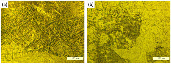 The microstructures of the sample in the two directions are shown in Figure 8 with a magnification of 500 times. The microstructures of the two directions exhibited martensite (α’) morphology (Figure 8a,b), which differs from the Ti-6Al-4V component fabricated by laser deposition with powders which exhibits a coarse α phase [21,22]. The martensite morphology proves that the cooling rate is faster compared with other AM process.