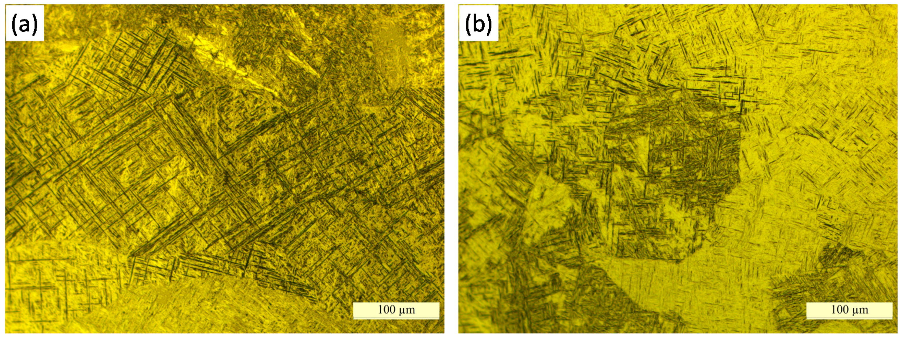 The diameters of the laser beams in References [9] and [21] were 4.7 mm and 5 mm, which means the size of the molten pool will be at least about 7 mm [9,21]. However, the size of the molten pool was smaller in this paper, about 5 mm; in this case, the heat can dissipate quickly. Moreover, the wire was inserted into the molten pool in the deposition process, which can take away part of the heat. Thereby, the cooling rate was faster in vertical wire feeding with an axisymmetric multi-laser source using the current process parameters, resulting in a martensite morphology.
