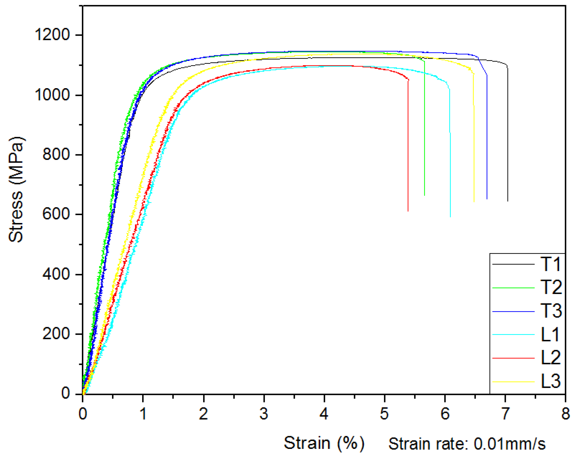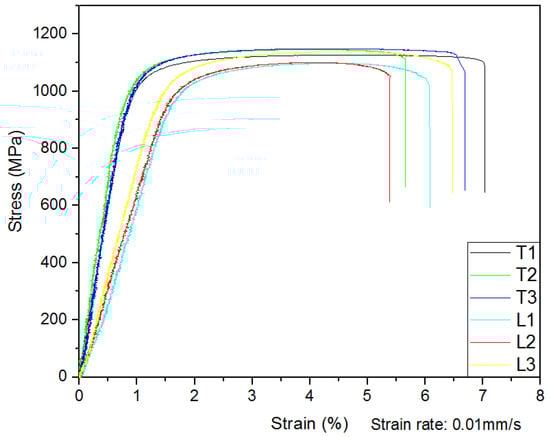 The results of the static tensile tests at room temperature are shown in Figure 9. The average ultimate tensile strength was 1140.33 MPa with the standard deviation of 11.59 in the T direction and 1114.67 MPa with the standard deviation of 20.81 in the L direction. However, the increase in the ultimate tensile strength resulted in a low strain (about 6%). The high strength and low ductility of the samples were mainly caused by the martensite.