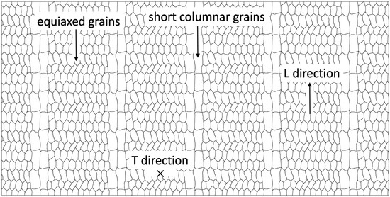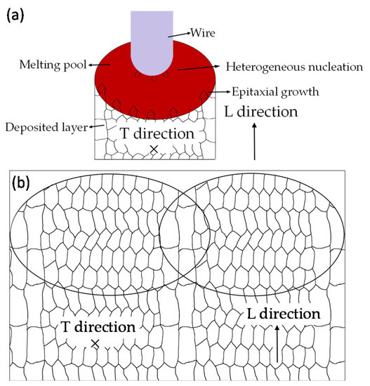 However, for the edge of the molten pool where the impact of the wire was small, a high temperature gradient still existed, leading to the formation of short columnar grains. Thereby, when the molten pool solidifies, short columnar grains will be formed on both sides of the molten pool and equiaxed grains will be formed in the middle. When the molten pool moves to the next track, remelting will occur, which makes the short columnar grains of the original molten pool remelt, contributing to the formation of equiaxed grains. New, short columnar grains will be formed at both sides of the molten pool, as shown in Figure 10b.