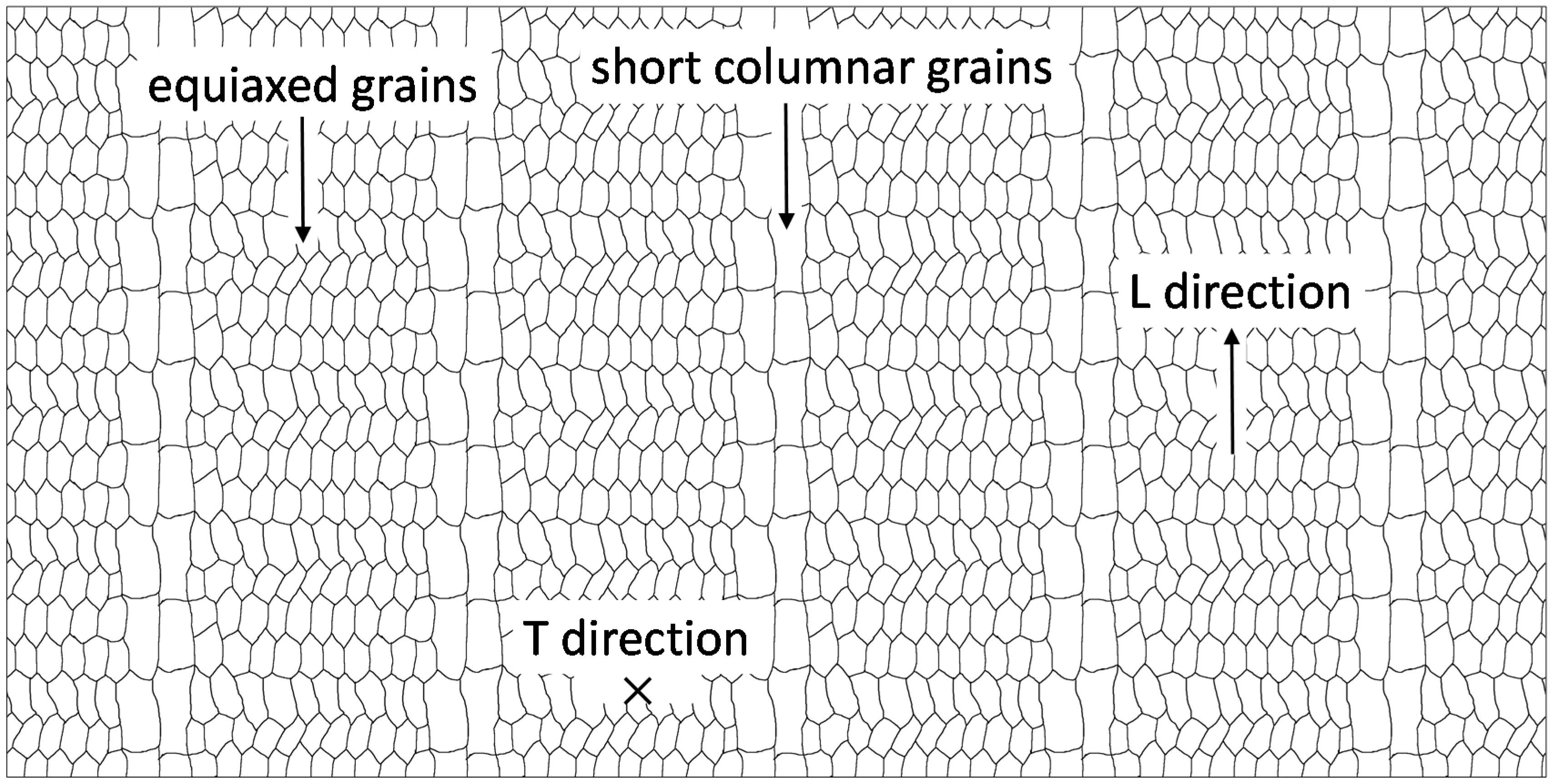 Figure 7 shows the macrostructures of the samples in the T (scanning direction) and L (building direction) directions. In the L direction, there were fine equiaxed grains evenly distributed with an average size of 81.5 μm, as shown in Figure 7a,c. In the T direction, most of the grains were equiaxed grains as well, but some columnar grains mixed with them, as shown in Figure 7b. The columnar grains were all short columnar grains (the aspect ratio of was less than five), as observed in Figure 7d; the average size of the short columnar grains was 338.6 μm in length and 122.5 μm in width. The average size of the equiaxed grains in the T direction was 101.9 μm (Figure 7e). A very important phenomenon could be observed as well: the position of the short columnar grains coincided with the moving path of the molten pool edge from one side to the other in the T direction, and the distance between the two parallel short columnar grains was 3 mm, which was the same as the deposit spacing.