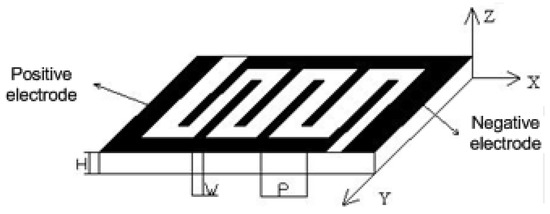 Due to the absence of piezoelectric capacity for the cement-based material, the piezoelectric property of IEPCM is up to that of the PZT powders [22]. That is, the higher the doping of PZT powder content acquires the better piezoelectric properties. Allowing for the requirements of the mechanical toughness and compatibility to concrete for the composite materials, we launched the simulation of the 0–3 type PCM mainly consisting of PZT-4 type powder and525-type sulphur aluminate cement by volume mixing ratio as 0.75:0.25. The polarization direction in the x-axis is set as positive, and conductive silver paste is coated on the top surface of PCM rectangular solid wafer as IEs pattern in the x-axis, as illustrated in Figure 1. The elastic stiffness coefficient matrix (c), dielectric constant matrix (ε) and piezoelectric stress constant matrix (e) of the IEPCM obtained by using ANSYS can be correspondingly given as follows [21].