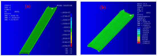 Here, the ratio of the transverse stress and strain of the IEPCM in the y-axis to the corresponding longitudinal ones in the x-axis are focused on. The static stress and strain distributions in the x- and y-direction of the IEPCM are shown in Figure 2a,b and Figure 3a,b.
