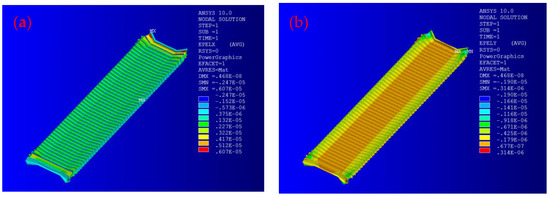 The maximum stress in the x-direction was 3.41 MPa, and it appeared on both ends of the IEPCM as shown in Figure 2a,b. Moreover, most of the stresses were about 0.704 MPa. The maximum stress in the y-direction was 1.31 MPa, and it also appeared on both ends of the IEPCM. Obviously, the corresponding IEPCM showed different driving stress responses in the transverse and longitudinal directions. As can be seen from Figure 3a,b, the maximum strain of the IEPCM in the x-direction was 6.07 με, and it appeared on both ends. In the middle region, the strain from the left to right sides between neighboring electrodes was altered from a high to low value, and the maximum value was 2.47 με. The maximum strain in the y-direction was 0.918 με, also appearing on both ends. In the middle region, the strain from the upper and lower sides between neighboring electrodes was also altered from a high to low value, and the maximum strain value was 1.16 με. The maximum strain ratio in the x-, y-direction at both ends, and in the middle region of the IEPCM, was 3.19, 2.69, respectively. It shows that there is a great difference between the transverse and the longitudinal strain, which presents an obvious orthotropic characteristic and can effectively meet the basic requirements of engineering needs as well.