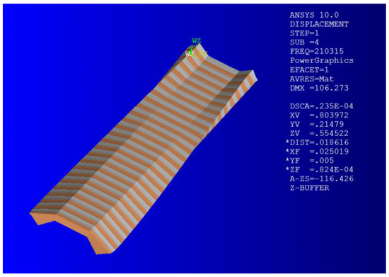In fact, the vibration characteristics of a structure, such as the vibration shape, and the modal frequency can be extracted through modal analysis, and when its natural frequency has no repeated phenomenon, it indicates that its principal mode is orthogonal. Here, the lower surface of the IEPCM is fixed, the applied voltage between the upper and lower surface is defined to be 0 V, and then its modal analysis with first 40 order frequencies is analyzed by the modal frequency ranging from 10 kHz to 300 kHz. Figure 4 shows the fourth-order vibration mode of the IEPCM.