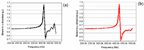 As is known, the harmonic frequency distributions and resonance response amplitudes of a structure can be achieved from the harmonic response analysis. In accordance with Reference [22], the harmonic response frequency range was set from 200 kHz to 500 kHz, the load sub-step was set as 30, and the harmonic response analysis of the IEPCM was carried out. The strains in the x- and y-direction on one point near the left edge on the top surface of the IEPCM were extracted and focused on, and the corresponding strain features changing with the frequency were obtained, as shown in Figure 5.