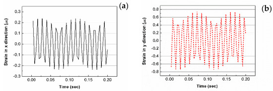 Strain distributions of IEPCM vs. time: (a) x-direction; (b) y-direction.