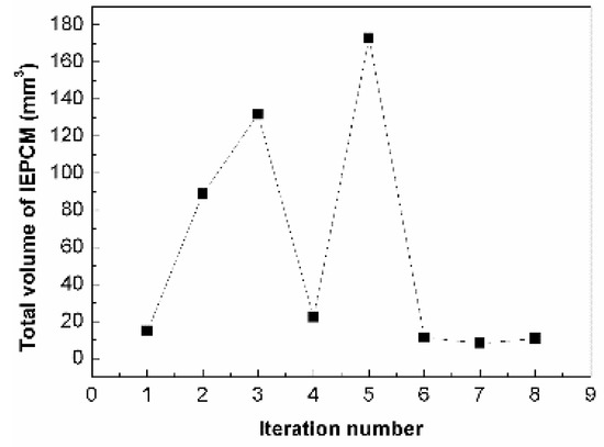The changes in the material volume of IEPCM vs. iteration numbers.