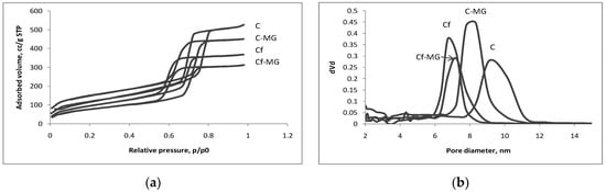 The nitrogen sorption isotherms were recorded on a Quantachrome Nova 2200 Instrument and Pore Size Surface Area Analyzer (Quantachrome Instruments, Odelzhausen, Germany) at −196 °C. Before measurements, the samples were outgassed under high vacuum at room temperature for 12 h. The Brunauer-Emmett-Teller (BET) specific surface area (SBET (m2/g)) was calculated from the linear part of the BET plot. Micropore area (Sμ (m2/g)) was determined by a t-plot method. The average pore diameter (Dp (nm)) was estimated using the desorption branch of the isotherm and the Barrett-Joyner-Halenda (BJH) model [29,41]. The volume of liquid nitrogen adsorbed P/P0 = 0.95 was used to assess the total pore volume (TPV (cm3/g)).