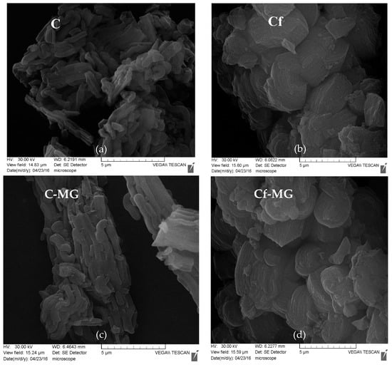 SEM images for: (a) pure SBA-15 silica (C); (b) functionalized SBA-15 silica with APTES (Cf); (c) magnolol loaded in SBA-15 silica (C-MG) and (d) magnolol loaded in functionalized SBA-15 silica with APTES (Cf-MG).