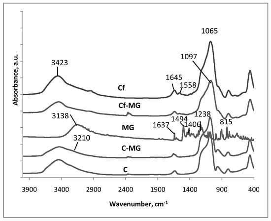 The FTIR spectra were collected on a Vertex 70 (Bruker Co., Billerica, MA, USA) using a KBr pellet technique. The KBr pellets were prepared by mixing 3 mg of silica sample with 500 mg spectroscopy grade KBr. Spectra were recorded on all formulations as well as on raw materials (C, C-MG, Cf, Cf-MG, MG). The spectra obtained were compared with those reported in the literature.