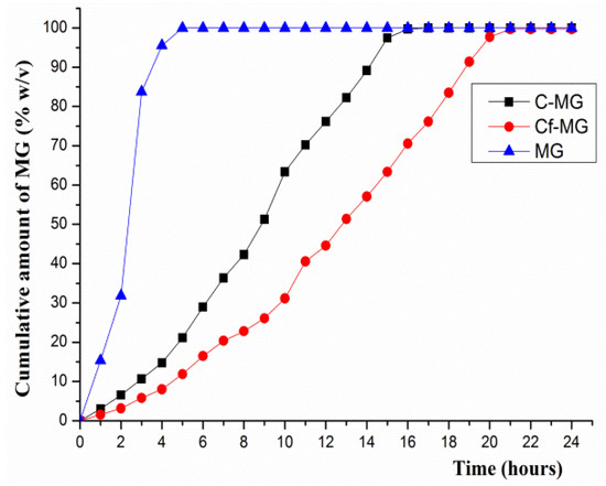 The second time-dependent stage of MG release has a duration of 15 h for the Cf-MG matrix and only 7–8 h for C-MG. The third phase of MG release begins once the steady-state concentration is reached, and eventually reveals the release of 100% of the MG loaded in the matrix.