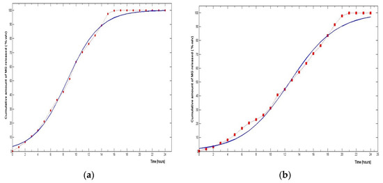 Sigmoidal plot of MG release from C-MG (a) and Cf-MG (b).