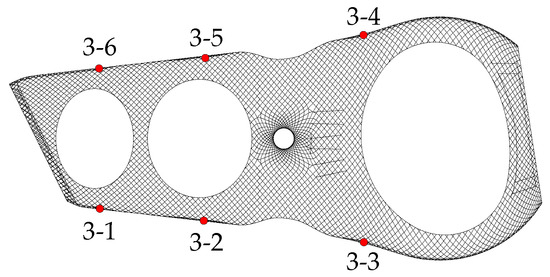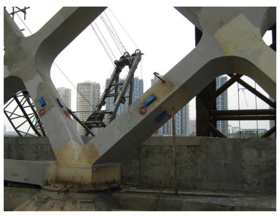 The structural health monitoring system of Shenzhen Bay Stadium began to be implemented in 2010, while the continuous monitoring of the steel roof in both the construction phase and service phase began to be carried out at the same time [11]. The stress measurements of the sensors located at the support members are chosen as the basic analysis data for example. The layout of sensors located at the support members are shown in Figure 1 and Figure 2. There are six supports, two rods of which are being monitored and four stress monitoring points are arranged on each rod; the sensor installation of support is shown in Figure 3. For example, the number of eight stress monitoring points at support 3-1 can be denoted as 3-1-1, 3-1-2, 3-1-3, 3-1-4, 3-1-5, 3-1-6, 3-1-7, and 3-1-8, respectively.