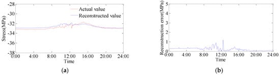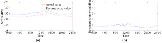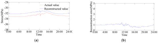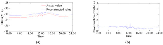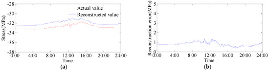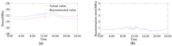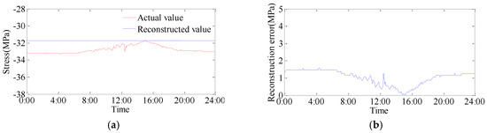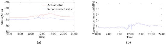 The stress monitoring data of the stress sensor 3-6-6, 3-3-2, 3-1-8, and 3-2-8 are used to reconstruct the stress measurements of the sensor located at point 3-1-4 on 16 May 2014. The contrast curves between reconstructed values and actual values are shown in Figure 4. The reconstructed values have the same trend as the actual values, and there are small differences between them. The average absolute error is 0.89 MPa and the relative error is 2.71%.
