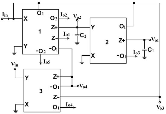 Next, various parasitic impedances of the CCCCTA in the proposed circuit were studied. Figure 3 represents the non-ideal CCCCTA model including its parasitic elements. A port Y parasitic is in the form RYi//CYi, a port Z+ parasitic is in the form RZi+//CZi+, a port Z− parasitic is in the form RZi−//CZi−, a port O1 parasitic is in the form RO1i//CO1i, a port O2 parasitic is in the form RO2i//CO2i, a port –O1 parasitic is in the form R–O1i//C–O1i, a port –O2 parasitic is in the form R–O2i//C–O2i, and a port X parasitic is in the form RXi where i = 1, 2, 3 and indicates the ith CCCCTA. After applying the non-ideal equivalent circuit mode of the CCCCTA in the proposed circuit, the denominator of the transfer functions becomes: