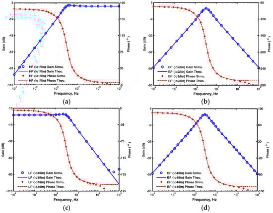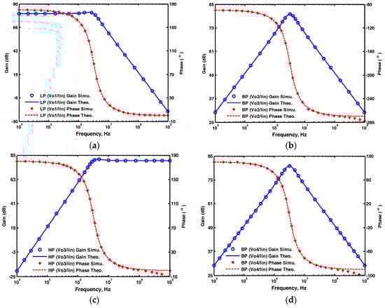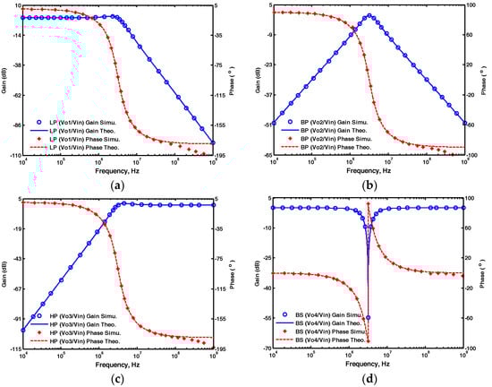 As indicated by Equations (19)–(22), an inverting LP filtering response is obtained from Vo1, an inverting BP filtering response is obtained from Vo2, a non-inverting HP filtering response is obtained from Vo3, and a non-inverting BP filtering response is obtained from Vo4. That is, the circuit provides TIM HP, LP and two BP responses simultaneously without disturbing circuit topology.