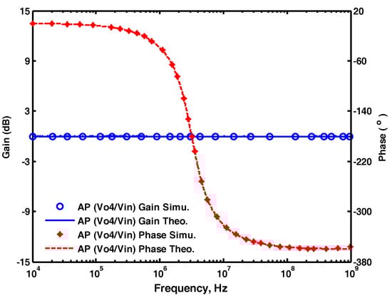 As indicated by Equations (23)–(26), a non-inverting LP filtering response is obtained from Vo1, a non-inverting BP filtering response is obtained from Vo2, an inverting HP filtering response is obtained from Vo3, and a non-inverting BS filtering response is obtained from Vo4. Notably, connecting the output current signal Io5 to the output voltage node Vo4 also obtains a non-inverting AP transfer function in VM as follows: