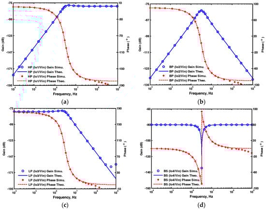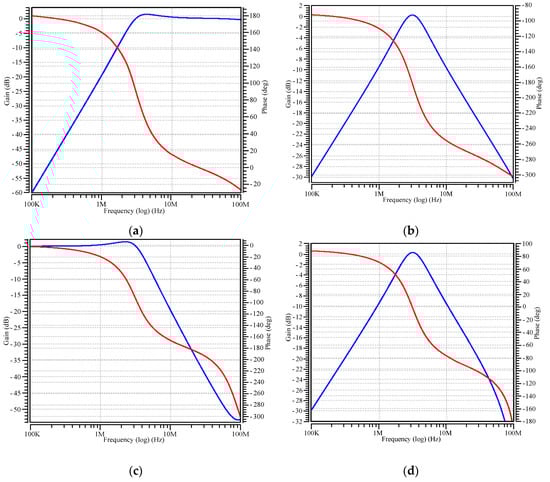 The TAM post-layout gain (blue line) and phase (red line) simulation responses (a) highpass filter (Io1/Vin); (b) bandpass filter (Io2/Vin); (c) lowpass filter (Io3/Vin); and (d) bandstop filter (Io4/Vin).
